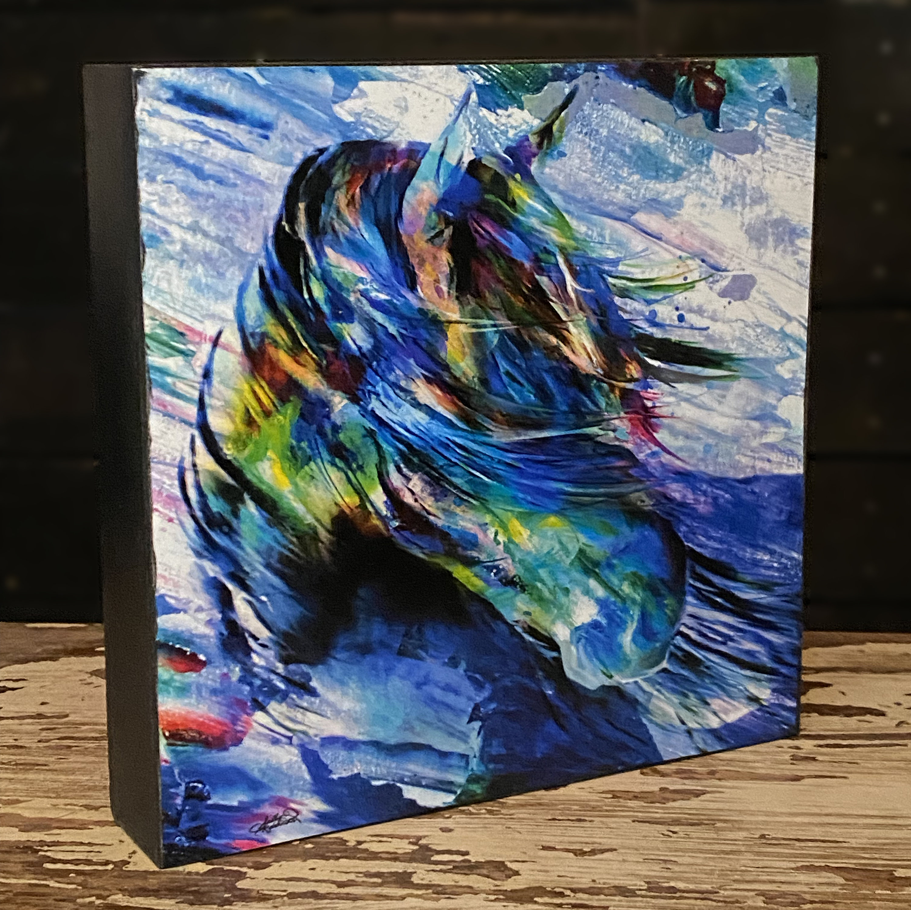 Experience the power and energy of Stormchaser, a colorful abstract artwork featuring a horse with its mane blowing in the wind. Printed on a sturdy wood block, this dynamic piece captures the wild spirit of nature in bold, vibrant colors.