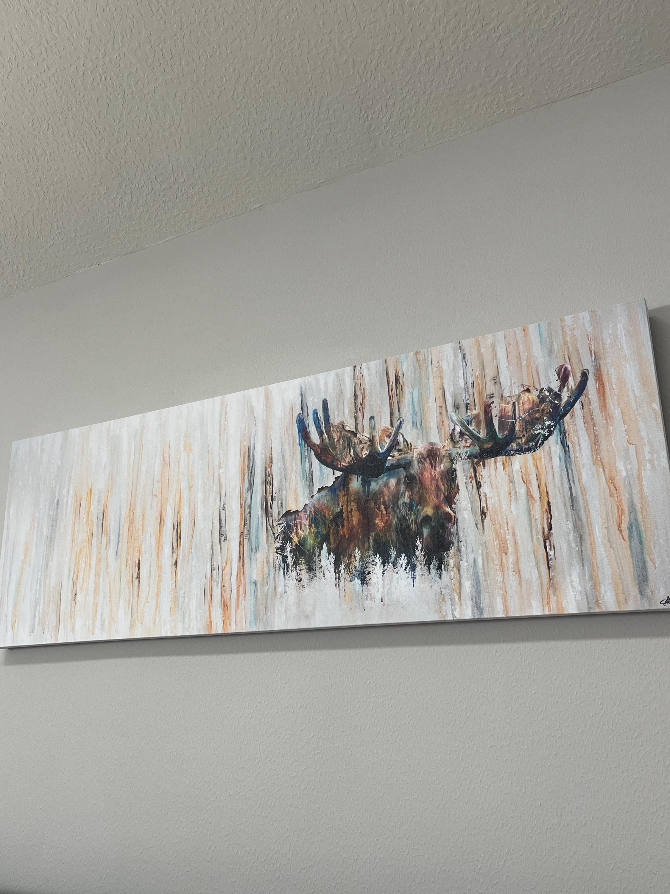 Blending abstraction and realism, the majestic moose emerges from the layered background, inviting the viewer into a moment of awe and reflection.