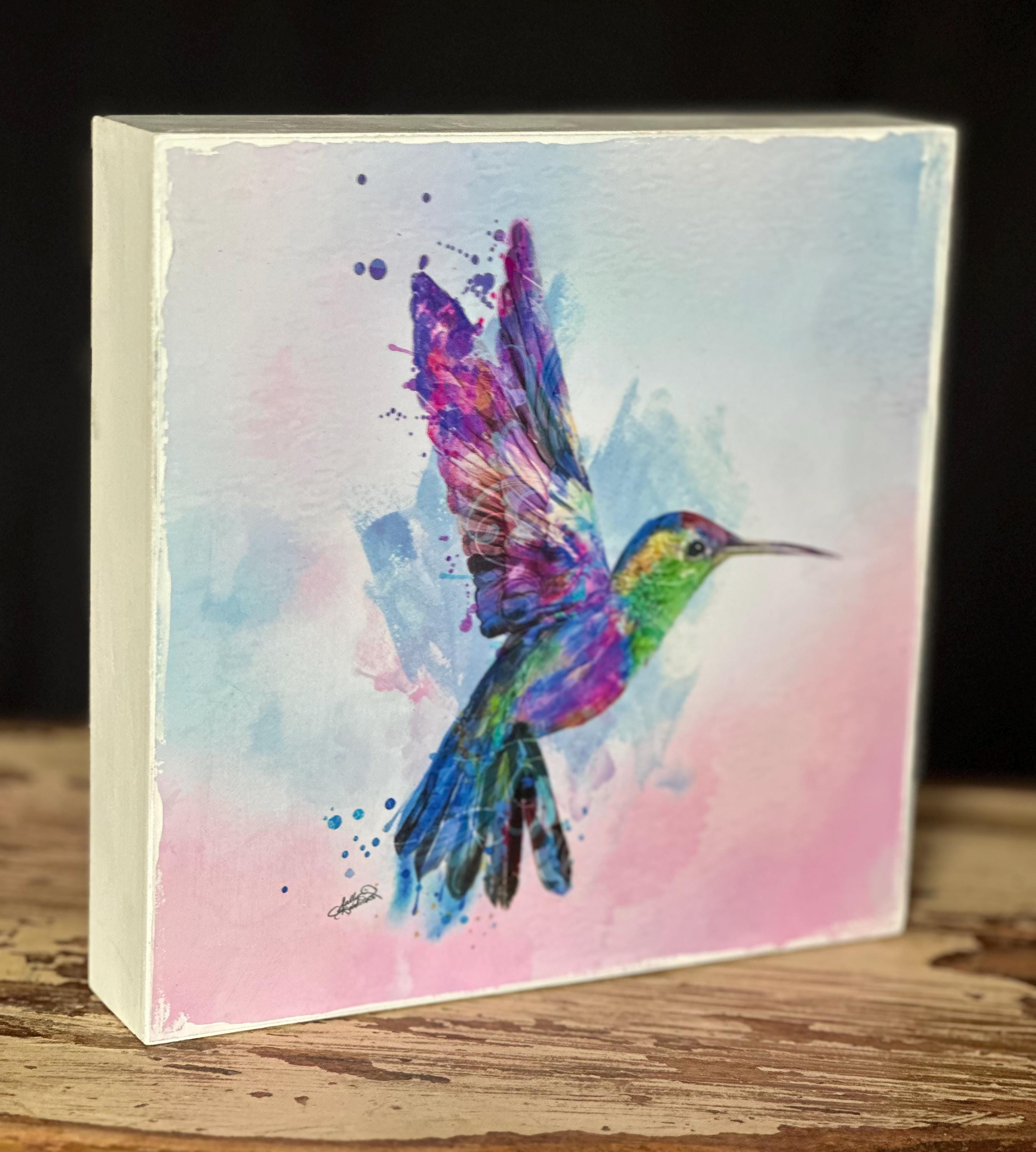 Bring vibrant energy and life to your space with this Hummingbird Artwork Block. Featuring a colorful, whimsical hummingbird in watercolor style, this piece is full of dynamic motion and beautiful hues. The 7.75" square block is accented with hand-painted whimsical edges, giving it a unique and artistic touch.
