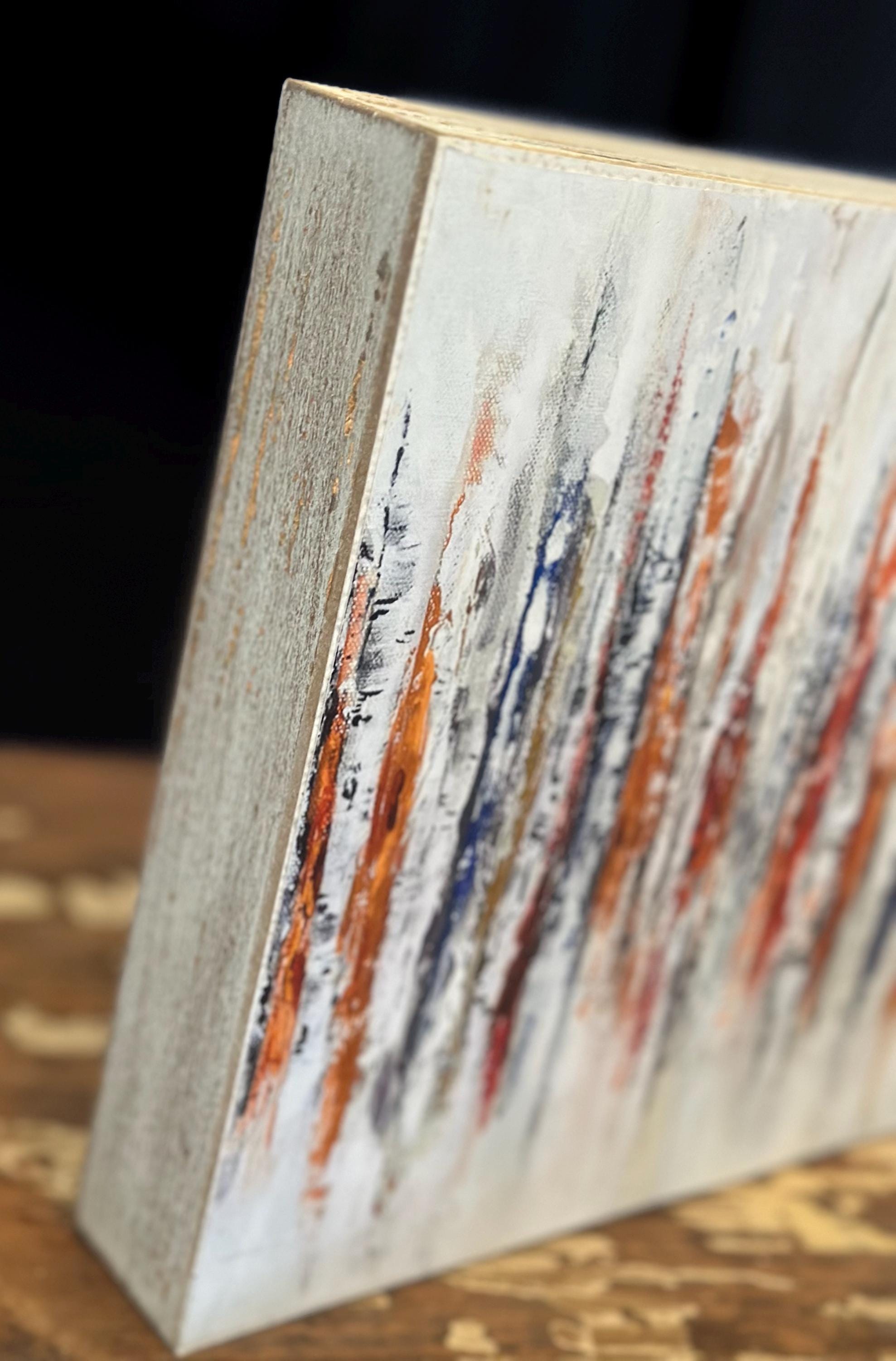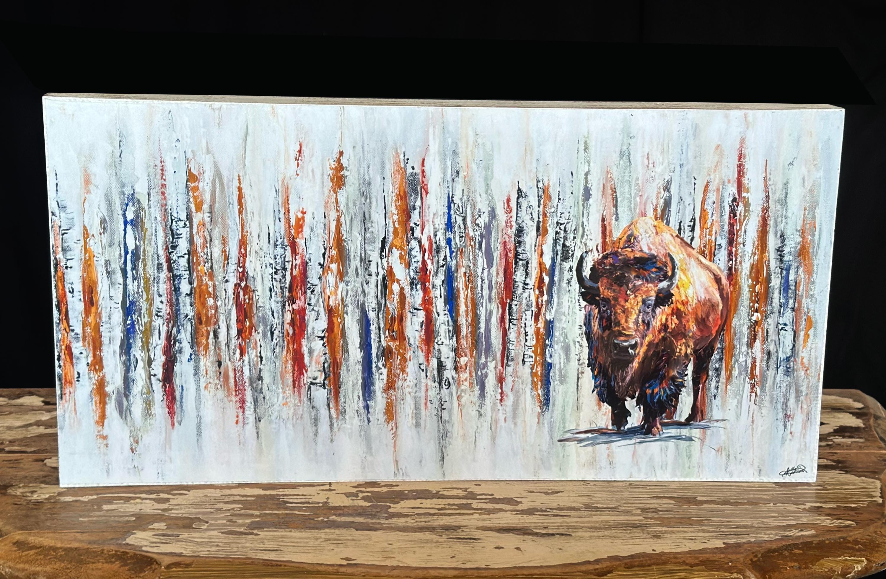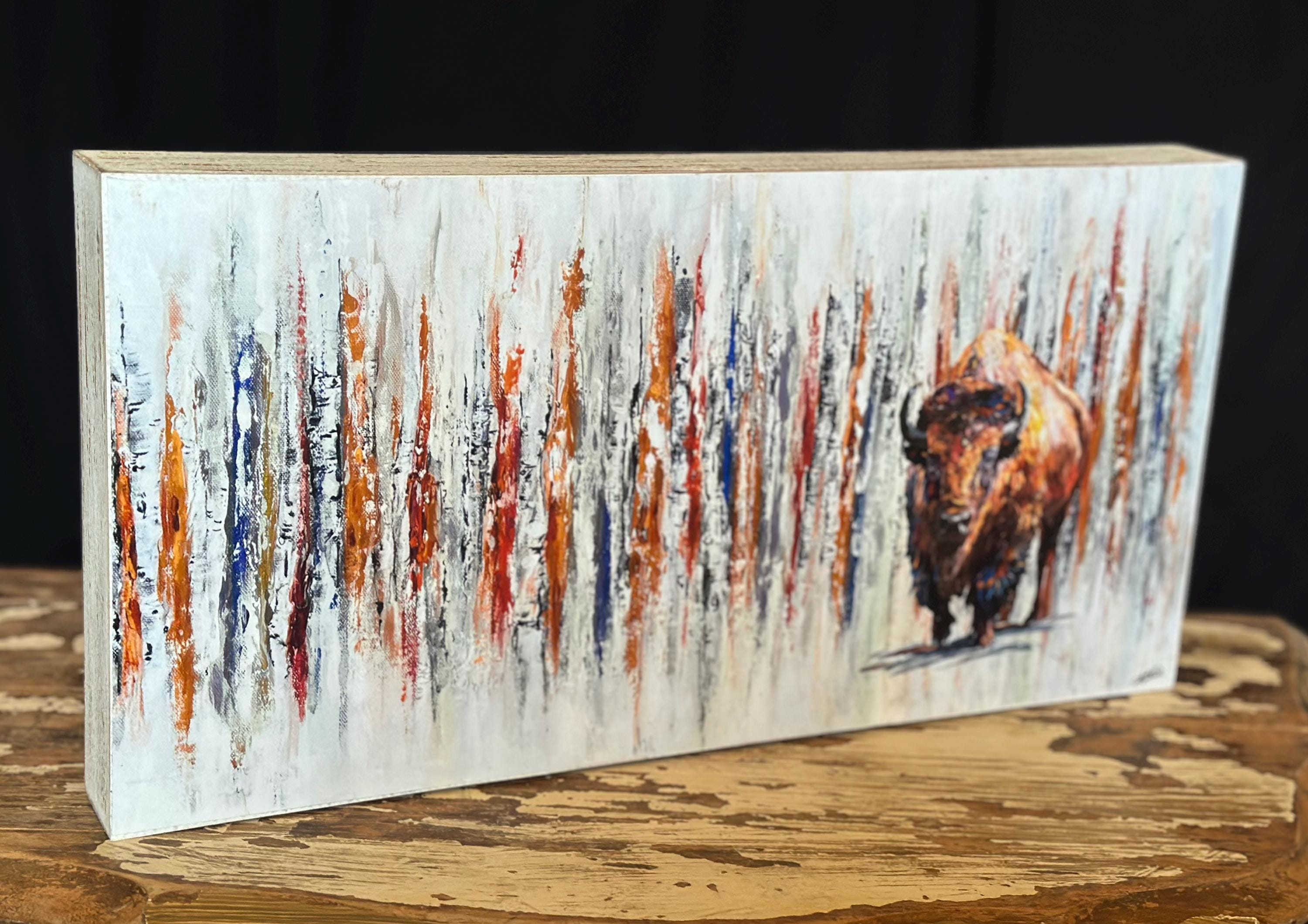 This striking piece, titled Buffalo Serenade, features a beautifully detailed buffalo set against a vibrant backdrop. The artwork is mounted on wood, with gold etching delicately applied to the sides, adding an elegant touch that enhances the piece's character and depth.