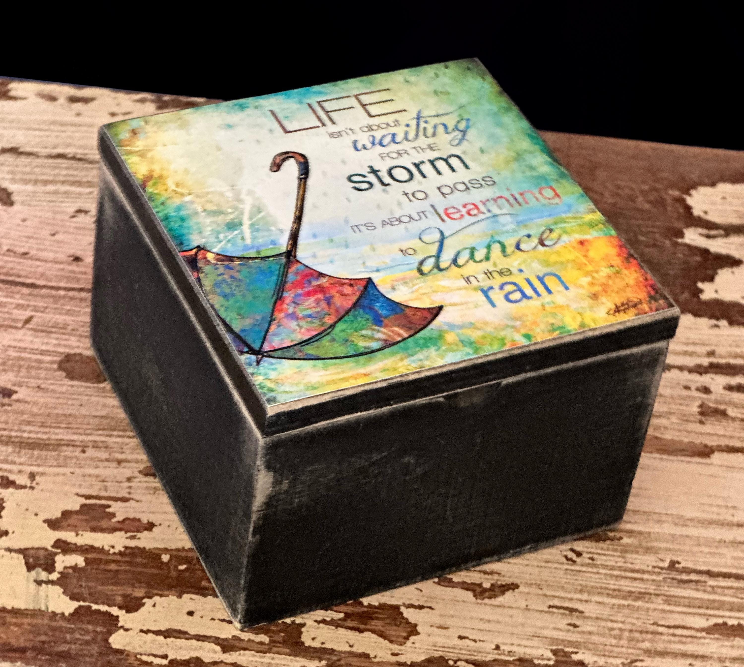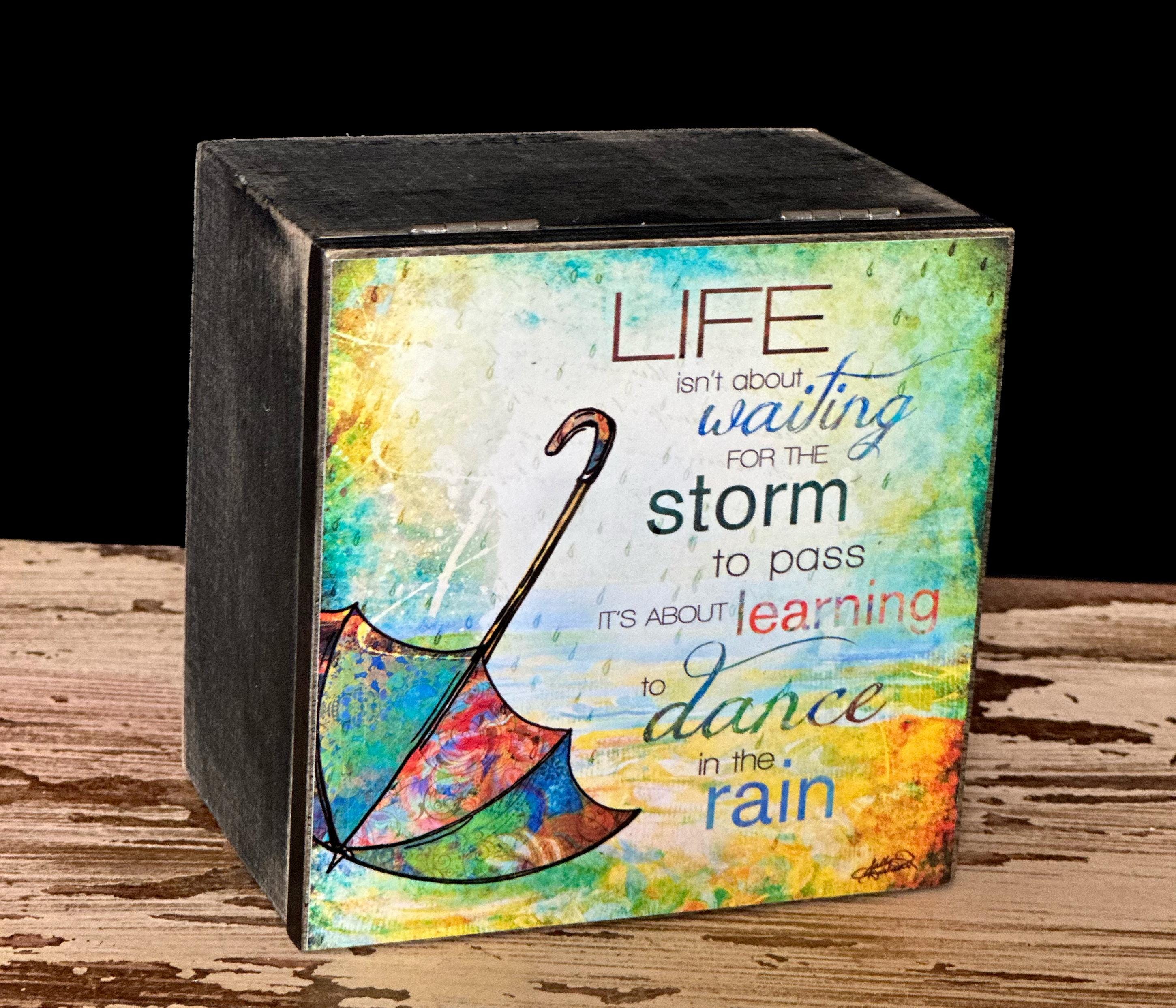 This charming 4x4 vintage-style box features my artwork titled "Dance in the Rain" with the inspiring quote: "Life isn't about waiting for the storm to pass, it's about learning to dance in the rain." The vibrant artwork, including a whimsical umbrella, serves as a reminder to embrace life's challenges with grace and joy. This piece is perfect for adding a motivational touch to your home or office, and makes a thoughtful gift for someone who needs a little encouragement.