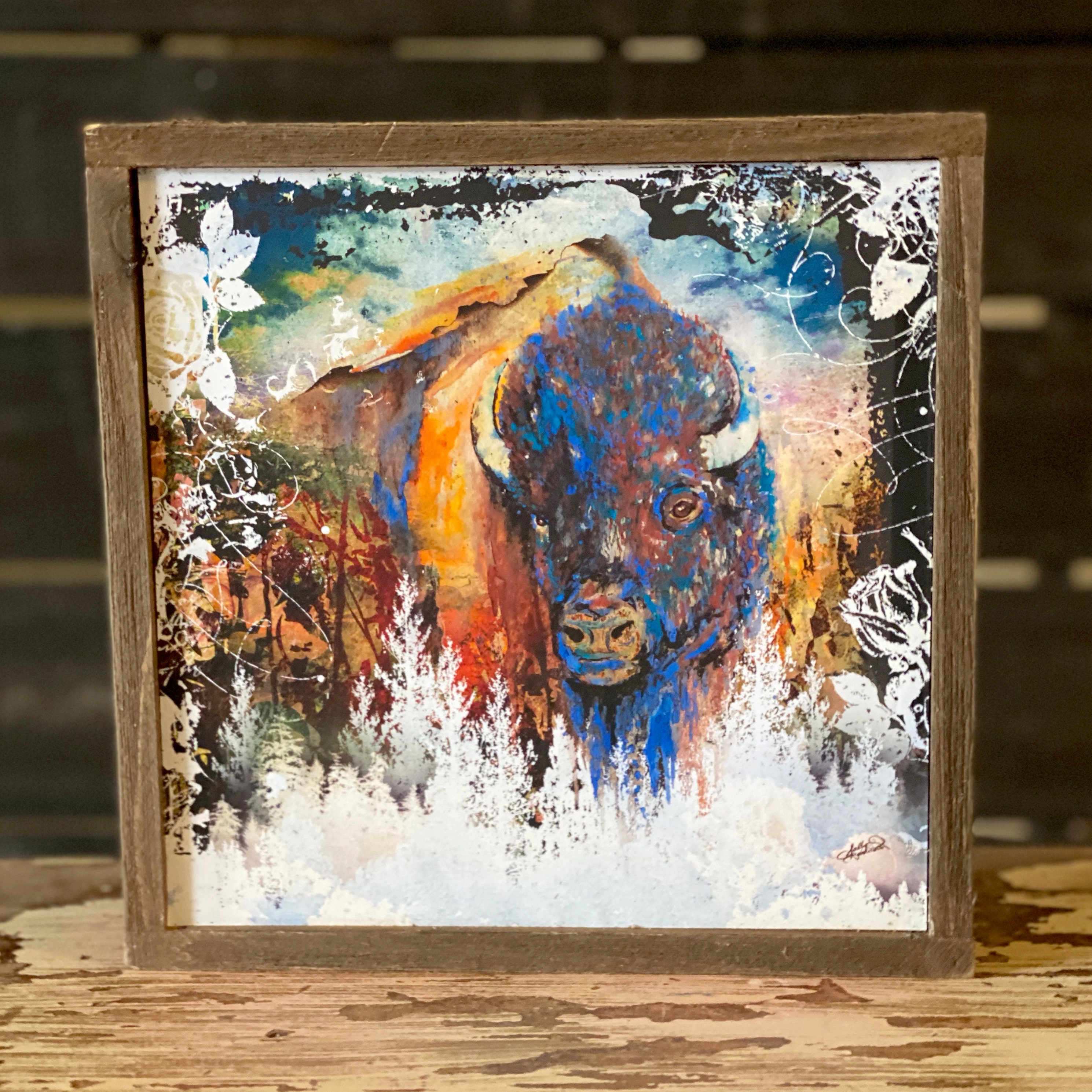 Untamed Buffalo Framed in Rustic Wood Frame - 8" x 8"